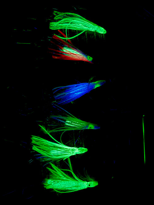 Hoochie-style squid skirts for trolling rigs. Sized for the Salmon Strike trolling configuration. Available in a range of colors and finishes — standard and UV-reactive — to cover different light conditions and water clarity. Sold in packs of 4.